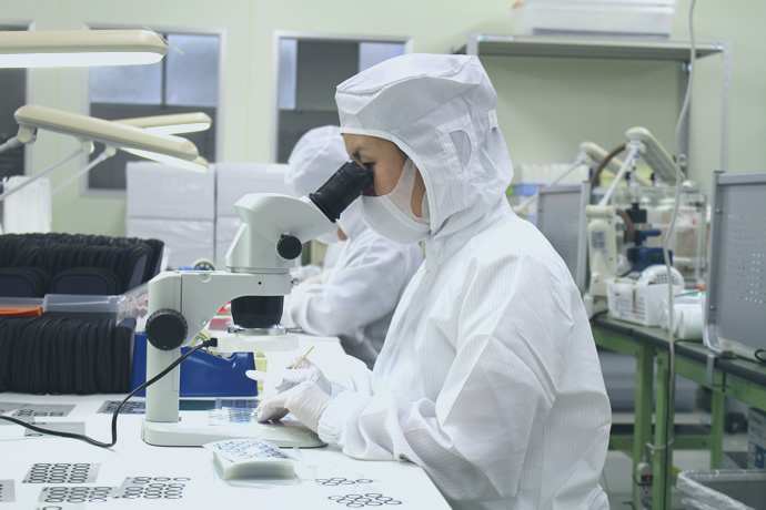 Centered on Tape and film processing, we also offer precise lamination and bubble reduction during lamination. We can also apply coatings to components using sprayers. All tape and film processing, lamination, and coating operations are performed in the cleanroom (ISO Class 1). This ensures stable mass production of products which must avoid the contamination of dust and foreign particles.