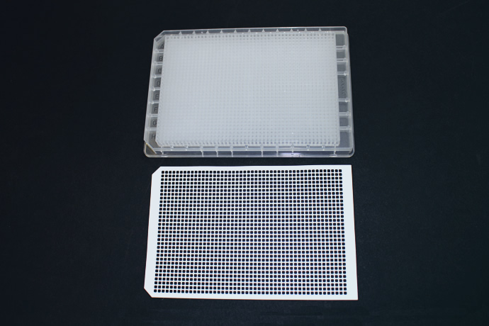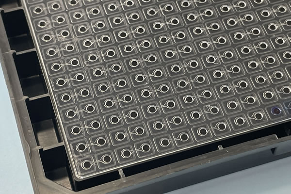 Example of adhesive tape lamination on the bottom of a 384-well microplate. Glass or PDMS sheet lamination to here is also possible.